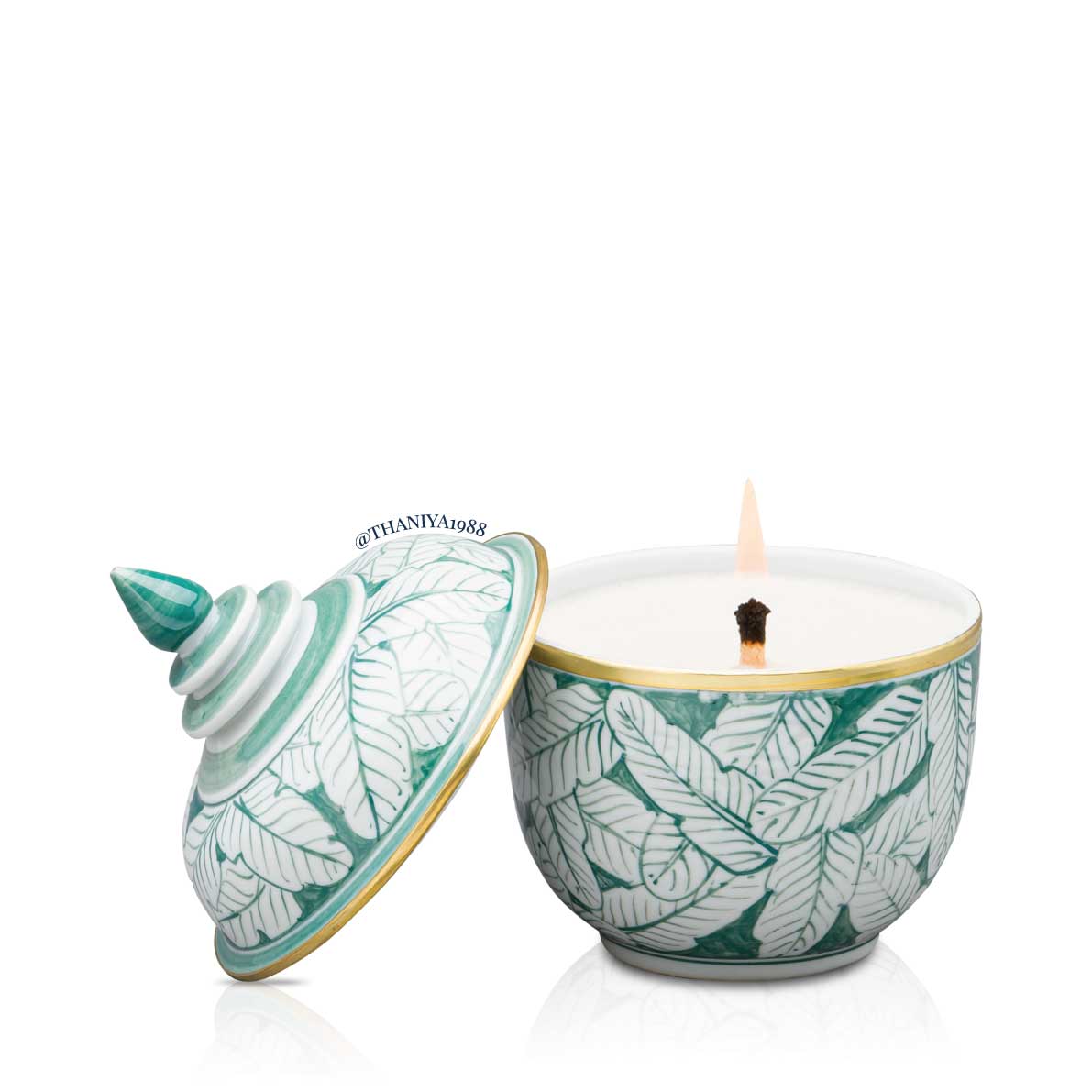 เทียนหอมในเซรามิกทรงชฎา ลายใบตอง